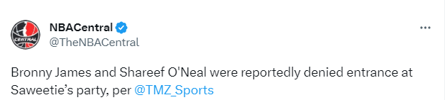据美媒报道,詹姆斯大儿子布朗尼和奥尼尔大儿子沙里夫-奥尼尔因为年龄限制被好莱坞夜店拒之门外;两人原本是要去参加说唱女歌手Saweetie的30岁生日派对,但因为布朗尼只有18岁,美国大部分夜店需要21岁以上才能入内,所以布朗尼因年龄限制被拒绝入内。