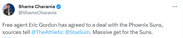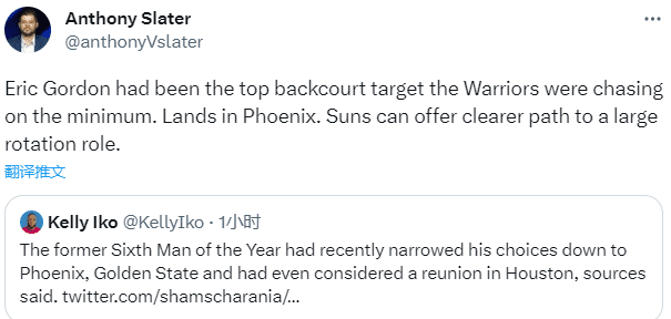 勇士记者Anthony Slater报道,戈登一直是勇士追求的头号目标,现在他确定前往菲尼克斯,太阳可以给他提供一个很大的轮换角色;据报道,戈登放弃了其他球队给的更大合同,接受老将底薪加盟太阳,目标剑指总冠军。
