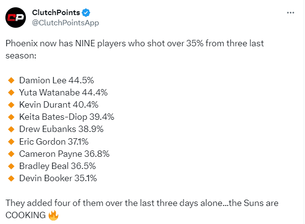 太阳打造一支进攻能力超级恐怖的球队,队内有9名球员上赛季的三分命中率超过35%——杜兰特40.4%、妹夫44.5%和渡边雄太44.4%、迪奥普39.4%、尤班克斯38.9%、戈登37.1%、佩恩36.8%、比尔36.5%和布克35.1%。