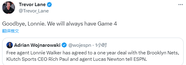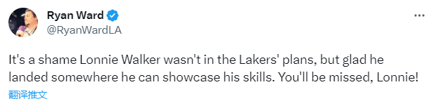 湖人队记Ryan Ward转推评论道:“很遗憾朗尼-沃克没出现在湖人的计划中,但很高兴他找到了一个可以施展自己技术的地方。我们会想念你的,朗尼。