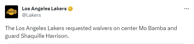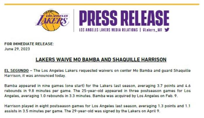 湖人官宣裁掉中锋班巴和后卫沙奎尔-哈里森,班巴2024-25赛季的薪水为1030万美元,为无保障合同。