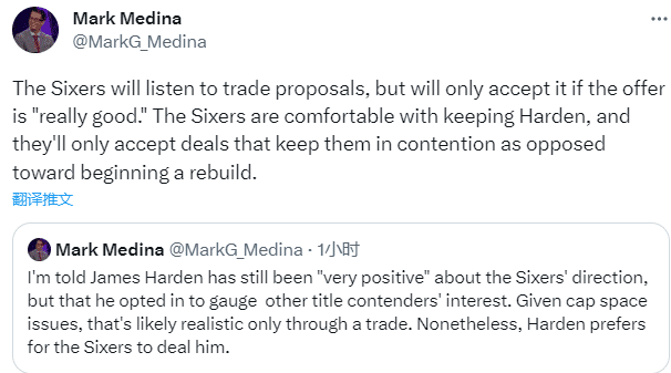 Mark Medina报道76人想用哈登换来能让球队保持竞争力的资产,只有报价非常好,他们才愿意交易哈登,目前他对留下哈登很满意。