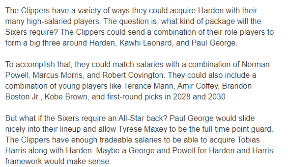 若76人索要全明星,快船可以送走乔治,用乔治和鲍威尔换来哈登和哈里斯的交易框架是有意义的。
