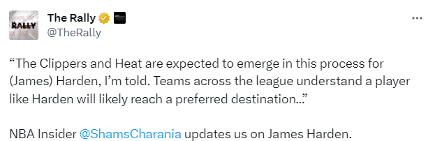 Shams表示:据我所知,在探索交易哈登的过程中,快船和热火预计会脱颖而出,整个联盟都明白像哈登这样的球员很可能会将他们作为首选目的地。