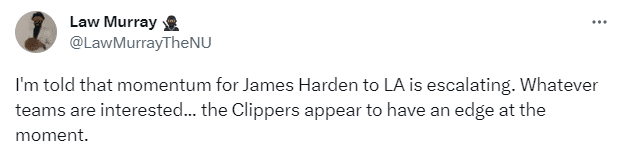 快船随队记者Law Murray跟进报道,詹姆斯-哈登加盟洛杉矶的势头正在升级,无论哪支球队对他感兴趣,快船目前似乎都很有优势。