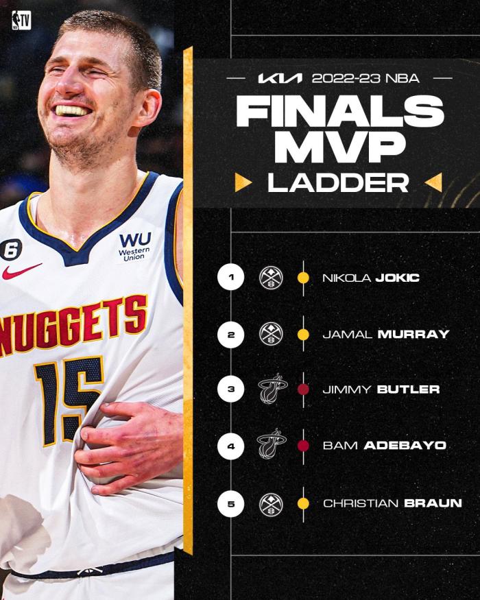 24直播网06月09日总决赛G3掘金大胜热火,掘金大比分2-1领先之后,NBA官方更新最新一期FMVP排名,约基奇继续位居第一,穆雷重返第二,掘金菜鸟布劳恩首次上榜。