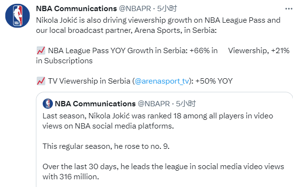 上赛季,约基奇在NBA社交媒体平台上的视频观看量在所有球员中排名第18位,这个赛季常规赛,他上升到了第9位。