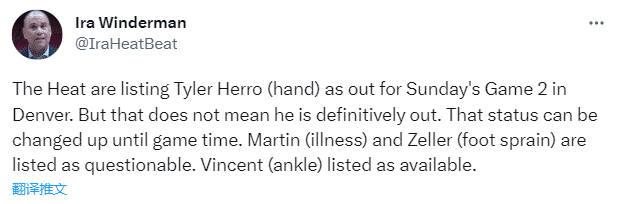 此前名记woj曾报道希罗有望G2复出,对此,热火主帅斯波表示:希罗的情况并没有改变,我不知道哪来的报道说他能在G2复出。