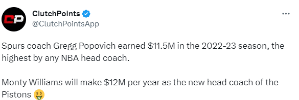 蒙蒂和活塞签下6年7200万美元的超级合同,平均年薪高达1200万美元,据美媒报道,蒙蒂年薪超越波波维奇(1150万美元)成为NBA史上年薪最高的主帅。