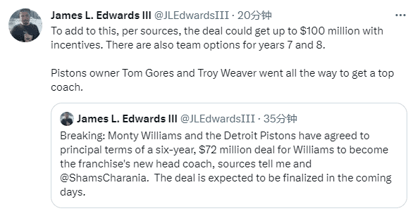 James L. Edwards III跟进报道称,蒙蒂这份合同(加奖励条款)最高可能达到8年1亿美元,包含第7年和第8年的球队选项;活塞队老板汤姆-戈尔斯和特洛伊-韦弗为了得到一位顶级教练不惜一切代价。