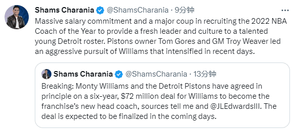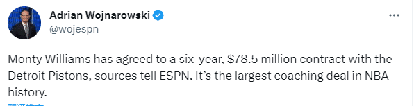 24直播网06月01日,太阳前教练蒙蒂再就业并且签下一份超级执教大合同,据名记shams报道,蒙蒂-威廉姆斯和活塞达成一份6年7200万美元的续约合同,将成为活塞新主帅,预计合同将在未来几天正式敲定,更多内幕曝光,蒙蒂合同最高能够达到8年1亿美元;woj跟进报道,蒙蒂已经和活塞签下6年7850万美元合同,这是历史最大执教合同。