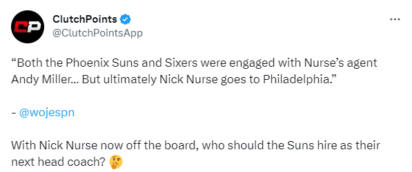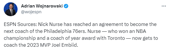 woj还透露双方达成合作的一些内幕:76人和太阳分别在过去两天与纳斯和他的经纪人进行了谈判,这让纳斯在两支竞争之间做出了艰难的决定,最终纳斯拒绝太阳,决定担任费城主帅。