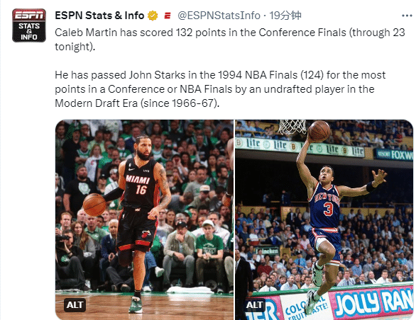 4、马丁东决系列赛总得分创造联盟历史上分区决赛或总决赛落选秀球员的总得分最高纪录。此前,约翰-斯塔克斯在1994年总决赛期间共得到124分。