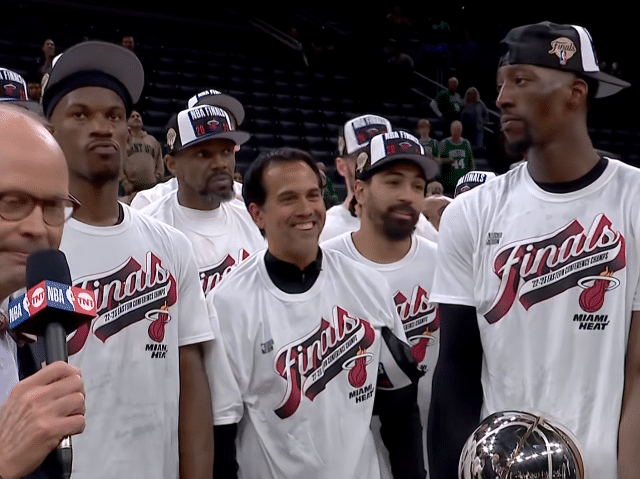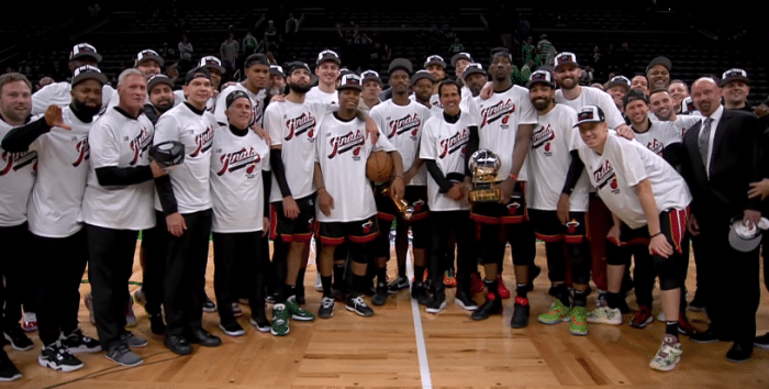 24直播网讯05月30日,NBA东部冠军诞生,热火东决4-3淘汰凯尔特人,正式夺得东部冠军,与掘金会师总决赛争夺总冠军;巴特勒(5票)险胜马丁(4票),生涯首次夺得东决MVP,在东部冠军颁奖典礼上,莫宁为热火颁发东部冠军奖杯,阿德巴约高高举起东部冠军奖杯,巴特勒获MVP后十分淡定,在东部冠军合影中,巴特勒抱着MVP站在C位,阿德巴约抱着东部冠军奖杯,热火全队将直接飞往丹佛.