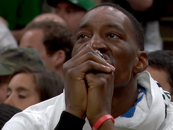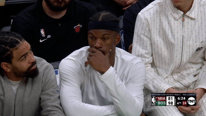 下半场,热火第三节最多落后到23分,一直被绿军压制,巴特勒找回手感,单节3中3拿到6分以及阿德巴约单节10分,可绿军攻势不减;由于分差太大,热火末节早早放弃比赛,第四节6分多钟,镜头给到热火替补席,巴特勒和阿德巴约都是一脸沮丧,2分19秒,镜头拍打巴特勒露出笑容,美媒调侃巴特勒笑着回到迈阿密,赛后巴特勒第一时间扭头离场。