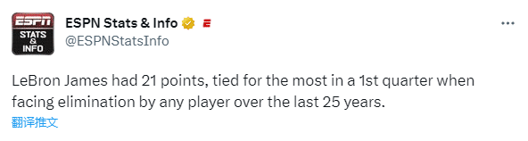 2、詹姆斯首节21分也平了近25年球员在生死战(输球就被淘汰的比赛)的首节最高分纪录