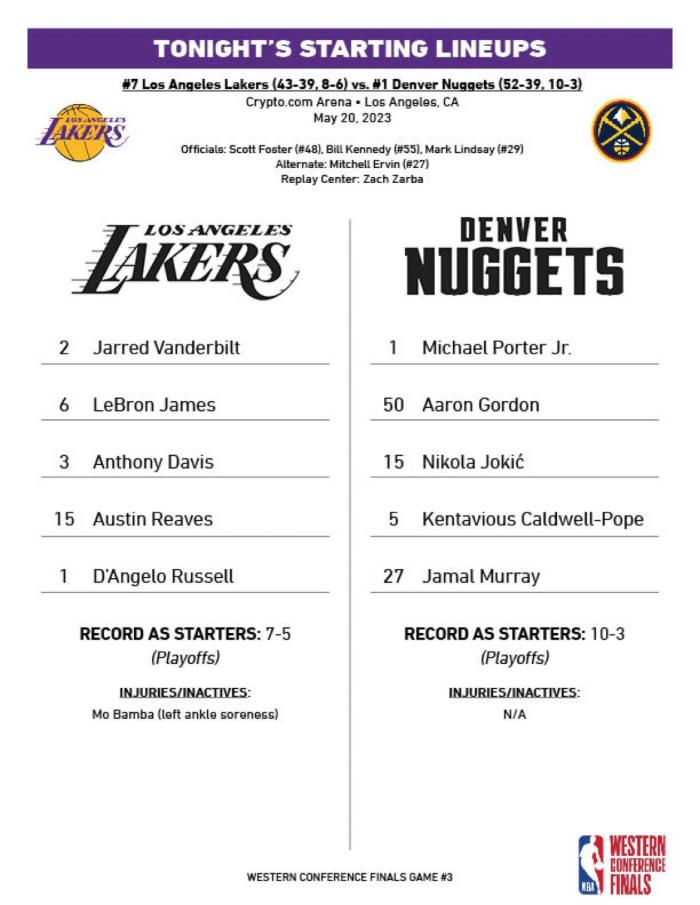 24直播网讯05月21日,湖人和掘金西决G3首发阵容出炉,湖人首发五虎是詹姆斯、浓眉、里夫斯、拉塞尔和范德彪,目标获胜拒绝0-3落后,这套首发季后赛7胜5负;另外湖人迎来利好消息,湖人中锋班巴最快西决G4复出;掘金延续原有首发,约基奇、穆雷、小波特、戈登和波普继续搭档首发。