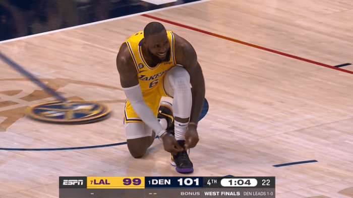 湖人和掘金西决G2,詹姆斯两次崴脚痛苦倒地,末节关键时刻,詹姆斯在防守戈登落地时踩到浓眉的脚,导致左脚踝崴了一下,当时詹姆斯痛苦倒地并且拍打地板,无法参加湖人的快攻反击,当里夫斯命中三分后,蹲着绑紧鞋带的詹姆斯露出了笑容。