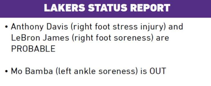 24直播网讯05月20日,湖人官方公布西决G3伤病报告,詹姆斯(右脚酸痛)和浓眉(右脚伤病)继续被列为大概率出战,班巴(左脚踝酸痛)继续缺席比赛;詹姆斯左脚踝伤势无碍,预计继续带伤出战;湖人夺冠概率仅有10.3%,哈姆G3会再次变阵吗?
