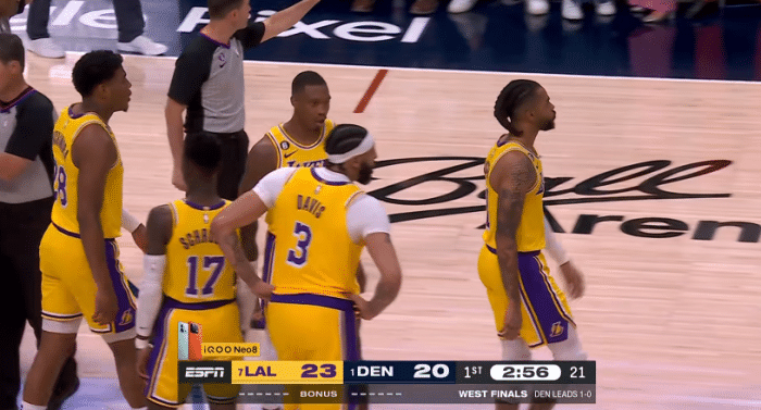 24直播网05月19日讯 湖人掘金西决G2正式开打,裁判吹罚引争议,第一节场上发生恶犯事件,拉塞尔恶犯放倒穆雷,詹姆斯摊手抱怨十分不满。
