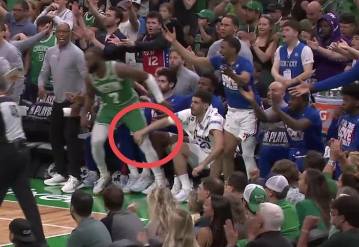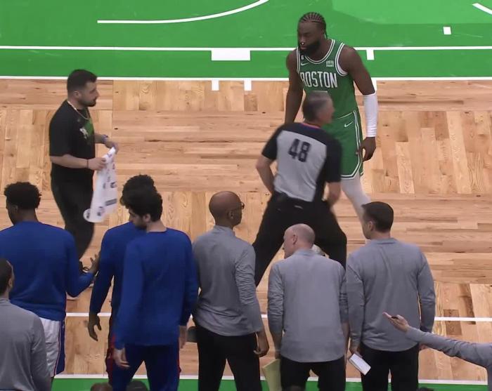 杰伦-布朗和哈登争夺球权冲入76人替补席,布朗有一个拉拽哈登球衣的动作,裁判未吹罚犯规,之后76人球员尼昂坐在替补席拉拽布朗的膝盖引冲突,布朗冲着费城替补席怒喷,双方发生口角,最终布朗和尼昂各自吃到一次技术犯规。