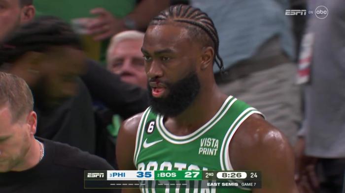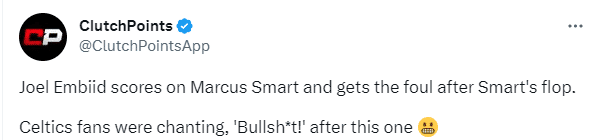 上半场最后阶段,恩比德背打撞倒斯玛特,后者有假摔嫌疑;斯玛特倒地后,恩比德上篮打成2+1,恩比德落地时有点踩到斯玛特的身体,凯尔特人球迷十分不满,怒骂裁判吹罚太垃圾。
