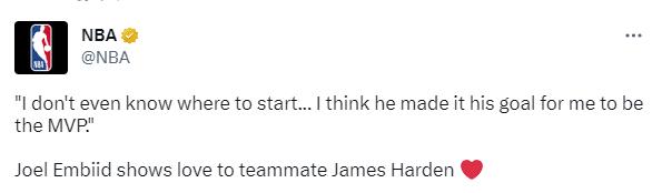 谈到哈登时,恩比德表示:我认为他给自己定了一个目标,那就是让我成为MVP,他放弃了很多。
