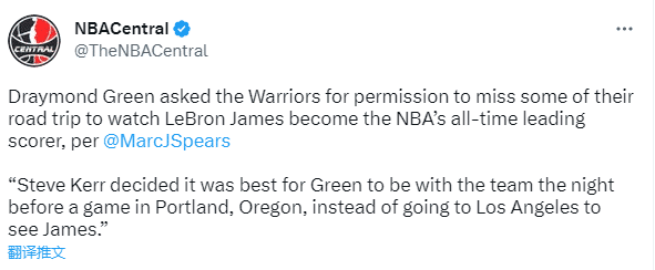 据报道,在今年2月9日勇士客场对阵开拓者前,格林向球队请假,希望他能缺席一些客场比赛,这样他就可以现场见证詹姆斯加冕历史得分王的时刻了。