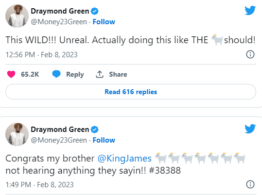 今年2月8日湖人主场对阵雷霆的比赛中,詹姆斯常规赛总得分正式超越贾巴尔,加冕NBA历史总得分王,格林因勇士将在客场对阵开拓者而缺席老詹的里程碑时刻,格林连续发推盛赞詹姆斯是历史最佳(7个山羊的表情)。