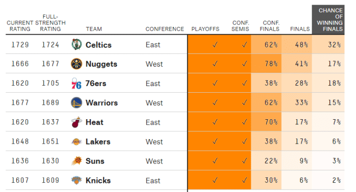 根据大数据网站预测,凯尔特人第二轮有62%的概率淘汰76人,掘金78%的概率淘汰太阳,勇士62%的概率淘汰湖人和热火70%概率淘汰尼克斯(热火大比分1-0领先)。