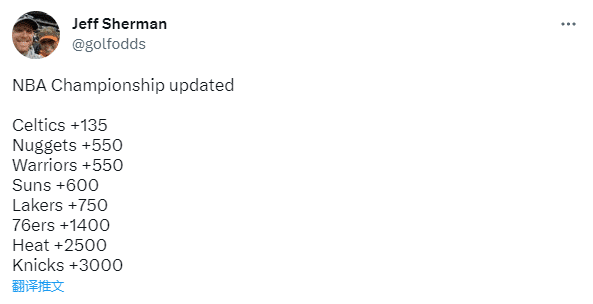目前凯尔特人是联盟中夺冠赔率最高的球队,他们首轮4-2淘汰老鹰,半决赛对阵哈登和恩比德领军的76人,双方G1将在5月2日上午7点30分开打,恩比德因伤大概率缺席第一场。