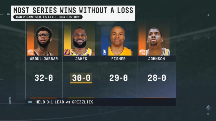 本赛季湖人先是3-1领先,G5输球无缘客场黑七,而今天詹姆斯有望延续不败纪录,把自己的纪录改写成31胜0负。