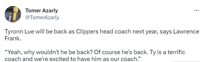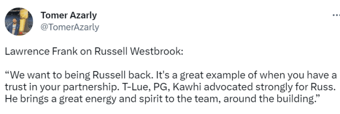 卡椒受伤后,威少扛起了快船,带来了强大的能量和更衣室领导力。他的表现得到球队和主帅的认可。快船出局后的第一时间,泰伦-卢就表态希望威少下赛季能继续为快船打球,而弗兰克也在今天的发布会上支持这一说法。“我非常信任他(威少),我们当时为他描述的角色,和他最终扮演的角色完全不同,他愿意一直适应球队。快船希望他下赛季回到球队中,卢、乔治、莱昂纳德都强烈支持威少。”
