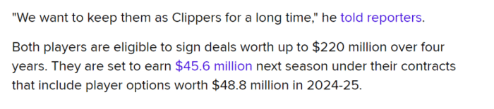 莱昂纳德和乔治的合同都还剩两年,2023-24赛季的年薪均为4560万美元,2024-25赛季都是价值4880万美元的球员选项。弗兰克表示:“我们希望快船能长期留下他们俩。”对于快船来说,这是一个重要的休赛期,老板鲍尔默预计下赛季要支付3.75亿美元的薪金和奢侈税。小卡和乔治都具备提前续签4年2.2亿美元顶薪的资格。