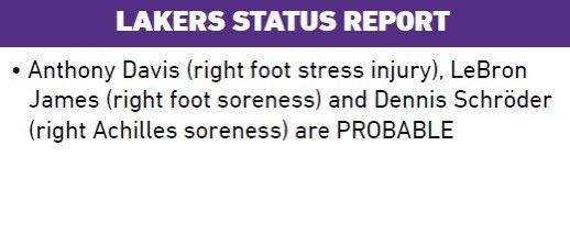 24直播网04月28日讯 ,湖人官宣系列赛G6伤情报告,安东尼-戴维斯(右脚应力伤势)、詹姆斯(右脚酸痛)、施罗德(右脚跟腱酸痛)大概率出战(75%出场可能性),这伤情报告与之前一样,预计湖人仍旧是全员都可以出战;詹姆斯或开启全力詹模式,湖人有望明天黑七晋级半决赛。