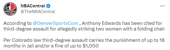 24直播网讯04月27日,森林狼首轮1-4被掘金淘汰出局后,狼队新星爱德华兹惹上官司,G5出局后挥舞椅子砸伤多人,因涉嫌用折叠椅殴打两名女性被指控为三级袭击罪,根据科罗拉多州的法律,爱德华兹最高面临18个月的监禁和1000美元的罚款。