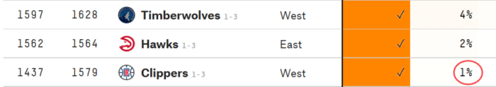 24直播网讯04月26日,NBA安排了三场季后赛大战,快船、老鹰、森林狼都面临1-3的绝境,其中,快船最不被看好。知名数据网站FiveThirtyEight列出了三队的晋级概率,森林狼4%,老鹰2%,快船最被看衰,只有1%。乔治和莱昂纳德将继续因伤缺席G5的比赛,而在赛前,乔治接受了记者采访,把莱昂纳德称为“战士”,希望威少下赛季能继续留在快船。