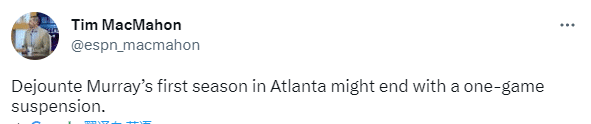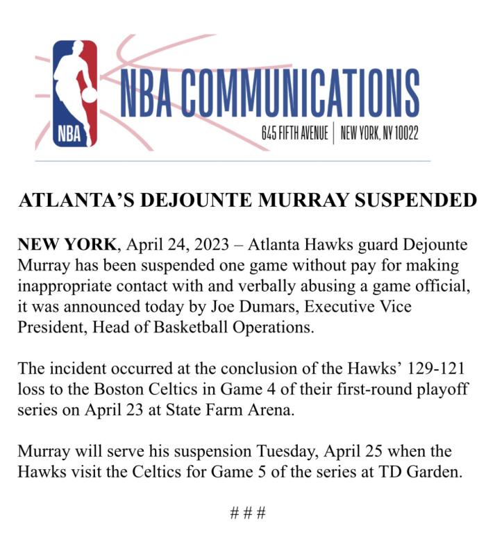 在老鹰输掉G4赛后,德章泰-穆雷贴面顶撞裁判,走开后依旧喋喋不休,联盟调查此事并且开出追加罚单,穆雷因此被联盟禁赛一场,缺席G5生死战;目前老鹰大比分1-3落后,再输一场就会被淘汰出局。