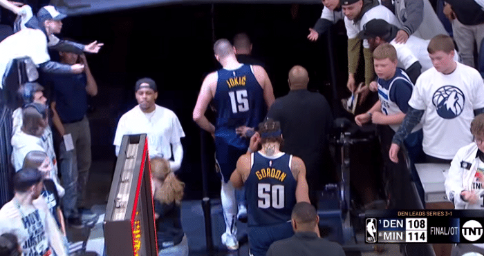 末节森林狼大部分时间占据主动权,第四节2分36秒森林狼96-82领先12分,之后约基奇轰进三分吹响反扑号角,小波特连续命中2记三分,约基奇强硬上篮,关键时刻造犯规两罚一中(若两罚全中,约基奇有望准绝杀),掘金144秒12-0扳平比分,生死时刻,爱德华兹运球失误,小布朗三分超时,两队打进加时赛。