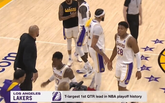 24直播网讯04月23日,NBA季后赛湖人主场迎战灰熊。此役首节,湖人打出了令人难以置信的比分。他们单节35-9领先灰熊,几乎只用一节,就让本场比赛失去了悬念。根据统计,26分的分差也追平NBA季后赛历史上,首节比赛的最大分差。赛前曾大放厥词的狄龙布鲁克斯,此役遭遇漫天嘘声,首节4中0没有得分。坐在替补席上,狄龙的表情也非常尴尬。