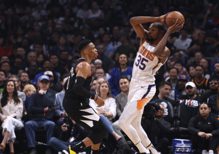 下半场,威少第三节开场带队9-0,随后布克和保罗带队追分,杜兰特上场后外线再中三分,招牌中投太无解,外线又中三分,单节独砍12分;威少则是单节10分,一个人扛着球队,大战太阳四巨头。