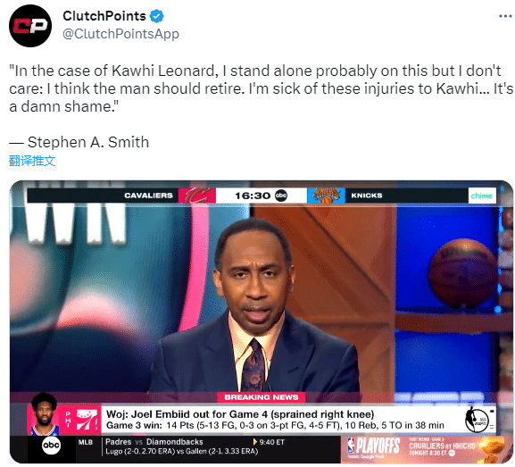 24直播网讯04月22日,快船官方宣布科怀-莱昂纳德因膝盖扭伤缺席G4,小卡继续伤停引热议,名记woj爆料小卡可能已经赛季报销了;名嘴炮轰小卡该退役了。