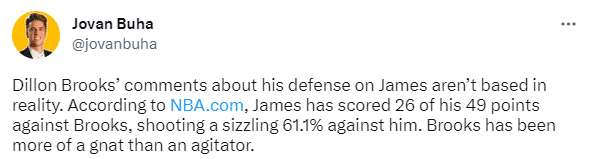 据统计,系列赛前两场比赛,詹姆斯总共拿到49分,其中有26分是面对狄龙拿到的,投篮命中率高达61.1%,湖人记者Jovan Buha直言狄龙就是个小虫子。