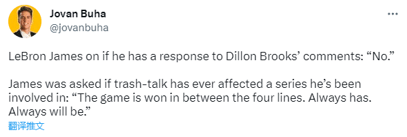 在湖人和灰熊系列赛G2,狄龙两次挑衅詹姆斯,赛后更是直言詹姆斯太老了,他是故意激怒詹姆斯;今日詹姆斯被问到是否回应狄龙挑衅的问题,直言:不。