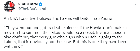值得一提的是,联盟匿名高管爆料,湖人一直有意特雷-杨,或下赛季推动这笔交易;该高管表示:“湖人现在手里有了一些交易筹码,如果老鹰今夏不采取行动,湖人下赛季就有可能推动这笔交易。我也不相信每位与Klutch经纪公司签约的球员都会去湖人,情况显然也不是这样。但湖人确实一直在关注特雷-杨。