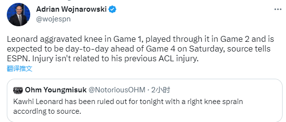快船队突然官宣莱昂纳德因右膝扭伤缺席G3,究竟小卡是怎么受伤的?据名记woj报道,小卡在G1中右膝伤势加重,带伤出战G2,G4的出战状态预计为每日观察,这一次的膝盖扭伤和之前的十字韧带撕裂受伤无关。