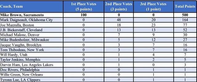 24直播网04月20日,NBA官方宣布,国王队主帅迈克·布朗正式当选为本赛季NBA年度最佳教练!而且根据官方消息,迈克·布朗获得了全部100张第一选票,创造历史。此外,湖人主帅哈姆得到1张第二选票。迈克·布朗的获奖实至名归,他也创下了多个历史纪录。