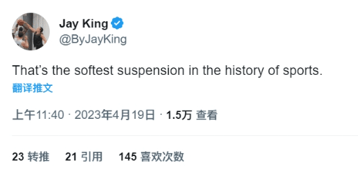 包括知名记者、凯尔特人跟队记者Jay King表示:“这是体育历史上最软的一次处罚。”很显然针对的就是追梦格林仅仅被禁赛一场,大家都认为追梦格林禁赛的场次太少了。
