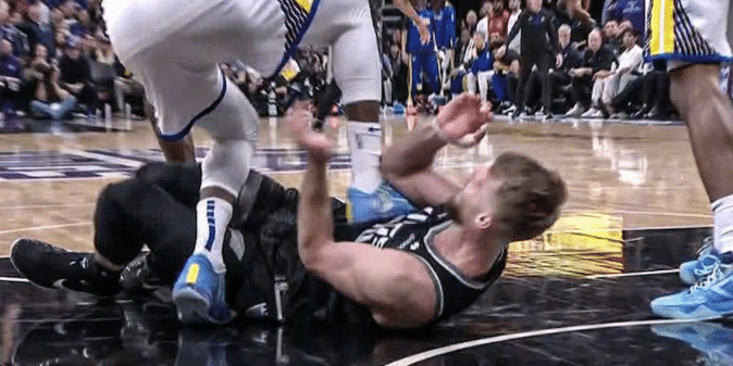 24直播网讯04月18日勇士在客场不敌国王,系列赛大比分0-2落后,这场比赛勇士的核心之一追梦格林在第四节被驱逐,原因是争抢篮板的时候,国王的萨博尼斯倒地,抱住了追梦格林的腿,后者直接踩在了小萨的肚子上,之后裁判给出的判罚是小萨技术犯规,追梦格林二级恶意犯规直接被驱逐出场。库里罚球命中,到了小萨博尼斯,他被踩之后很久才起身,站上罚球线明显受到影响,两罚全丢了。