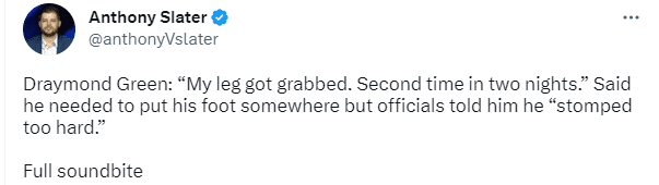 赛后格林回应踩人事件,表示:我的腿被抓住了,这是两个晚上里的第二次,而裁判只是在看,我总得把我的腿落在什么地方吧。裁判解释(驱逐)是因为我踩得太用力了;对于0-2落后,格林十分兴奋,微笑着说这是一个新的挑战。